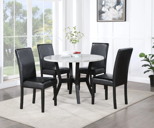 This 5-piece round dining set is expertly crafted to deliver a perfect balance of modern elegance, everyday comfort, and functional design. Featuring a sleek round tabletop paired with contemporary upholstered chairs, this set creates a welcoming and stylish dining environment ideal for both casual meals and intimate gatherings.