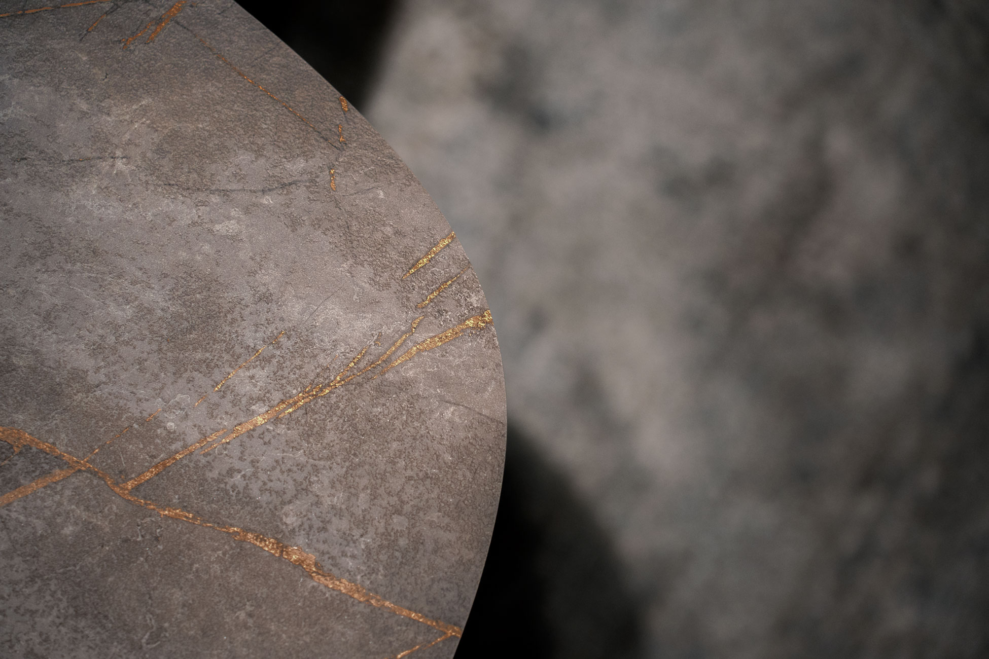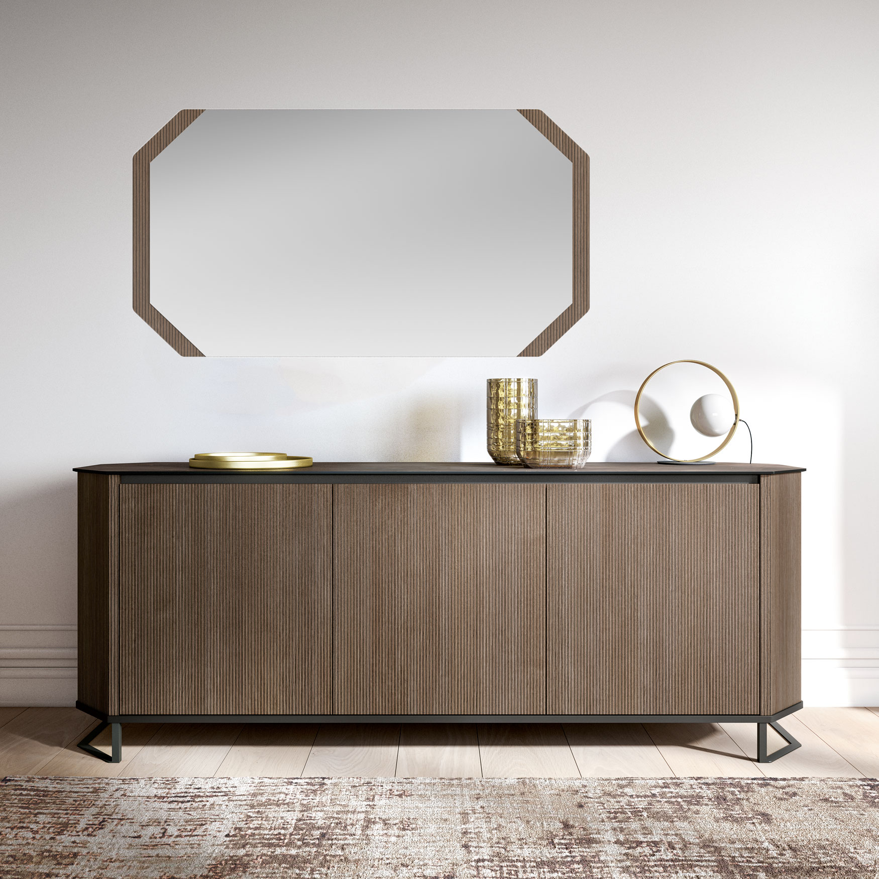 The Hexagon dining room collection from Status company in Italy. It features a top made of 10mm thick, high-density CDF wood fibreboard with a Gold Marble matte finish. The inner top and bottom panels are 28mm thick engineered wood with an Anthracite color finish, complemented by 1mm thick ABS edges. The 18mm thick side panels and back panel are covered with a Honey Ribbed matte wood finish, using a folding system and 1mm ABS edges. It includes 6mm thick tempered glass shelves and doors, with options for a wood door or a frosted/transparent glass door. The unit stands on iron feet with a matte Anthracite finish and is equipped with soft-closing metal hinges.